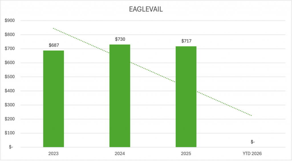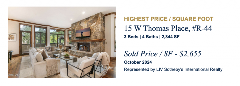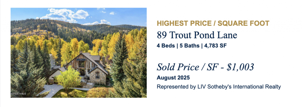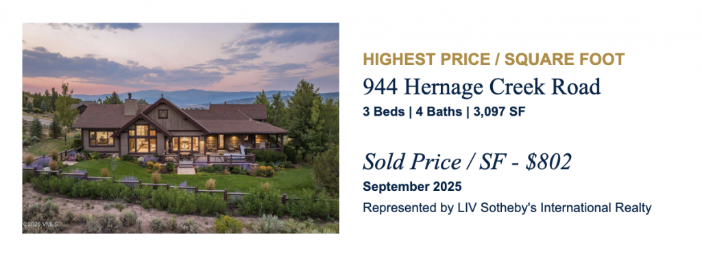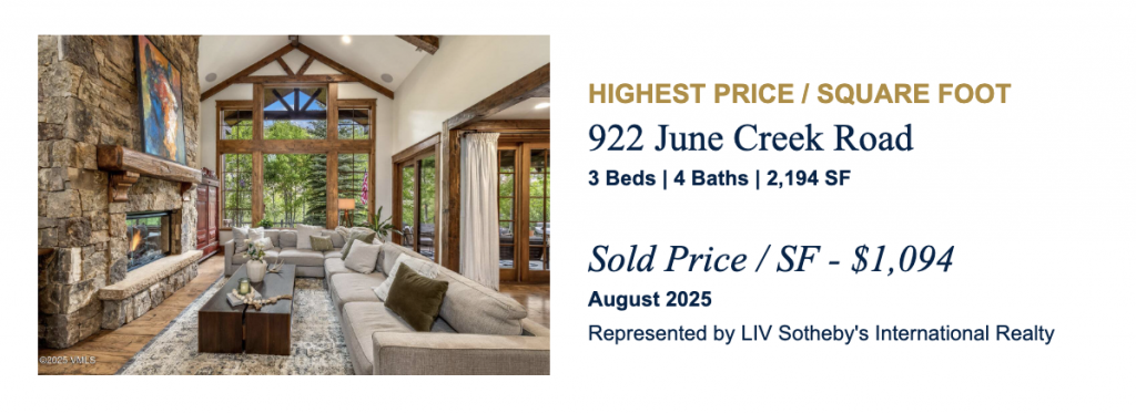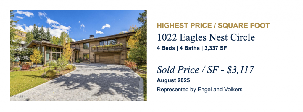 EagleVail has shown relative stability over the past three years, moving from the high $600s in 2023 to the low $700s range in 2024 and 2025. In the last 12 months, there have been 6 properties closed above $900/sf. That consistency suggests a balanced market where pricing is supported by location, accessibility to both Vail and Beaver Creek, and strong full-time residency demand.
