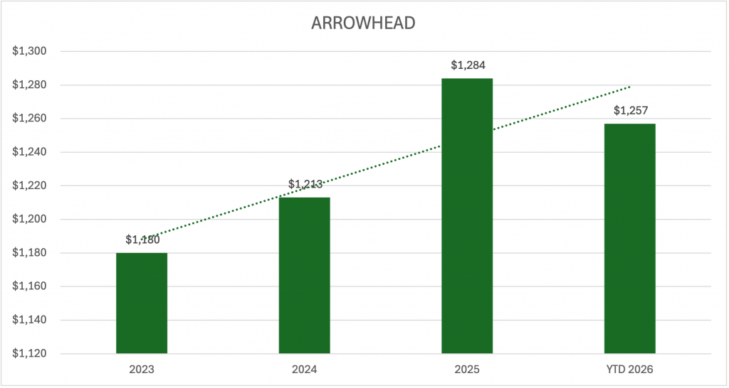 Arrowhead saw steady appreciation through 2025, peaking at $1,284/sf before a slight normalization in the first 60 days of 2026 to $1,257/sf. Importantly, values remain meaningfully above 2023 levels. In the last 12 months, there have been 2 properties closed above $1,800/sf. This reads less like a correction and more like market recalibration after accelerated growth. For buyers watching for “declines,” this illustrates the nuance – modest adjustments within a broader upward trend.