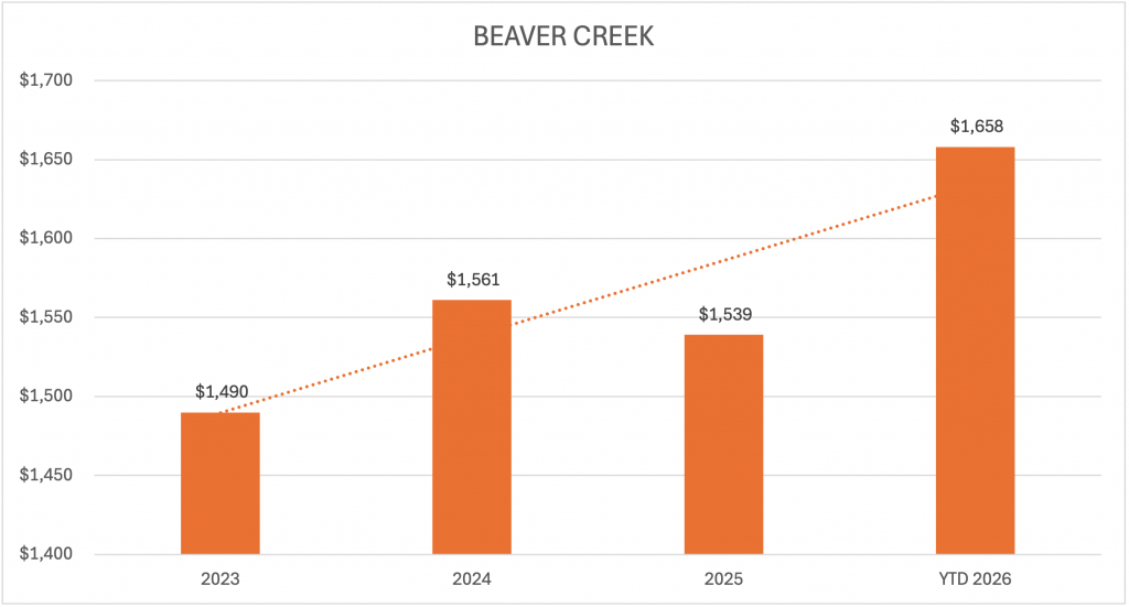 Beaver Creek demonstrates one of the steadiest upward trajectories in the valley. From $1,490/sf in 2023 to $1,658/sf thus far in 2026, the appreciation has been measured and consistent. In the last 12 months, there have been 13 properties closed above $2,000/sf. This signals sustained demand for gated privacy, resort amenities, and established luxury positioning. Rather than volatility, Beaver Creek shows disciplined growth, which can be a hallmark of stable, affluent markets.