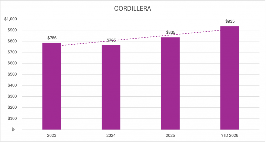 Cordillera shows one of the most compelling growth stories. After remaining in the mid-$700s range in 2023–2024, prices climbed to $835/sf in 2025 and have risen further to $935/sf so far in 2026. In the last 12 months, there have been 7 properties closed above $1,000/sf. This upward movement reflects renewed confidence in private, gated communities with more expansive lots and views. This is a clear example of demand strengthening rather than weakening.