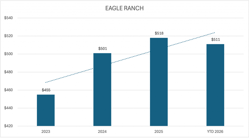 Eagle Ranch continues to demonstrate steady, disciplined appreciation. Price per square foot has risen from $455 in 2023 to $518 in 2025, with YTD 2026 holding strong at $511. In the last 12 months, there have been 5 properties closed above $700/sf. While there’s a slight moderation to the start of this year, values remain meaningfully above 2023 levels, reinforcing a clear upward trajectory rather than any sign of correction.
