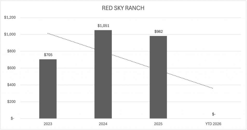 It’s important to note that Red Sky Ranch represents an ultra-exclusive, low-turnover area, with only a handful of transactions each year. In markets of this scale, a single high-end sale can materially influence annual price-per-square-foot averages. The resulting variability reflects limited inventory rather than instability. Even with that note, values remain substantially above 2023 levels and the broader trend remains elevated compared to prior years. In the last 12 months, there have been 3 properties closed above $1,000/sf.